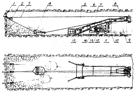 安裝使用示意圖↑1、固定楔 2、尾輪 3、鋼絲繩 4、耙斗 5、簸箕口 6、連接槽 7、中間槽 8、卸載槽 9、礦車 10、軌道 11、導向輪 12、操縱機構 13、絞車 14、臺車 15、升降裝置 |