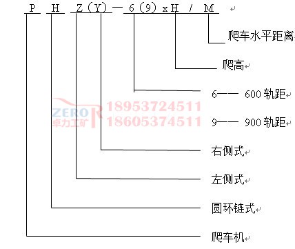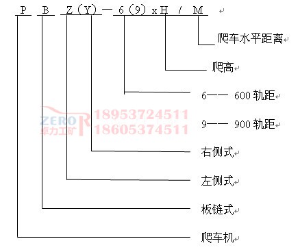 液壓鏈式爬車機用于600軌距1t、1.5t及900軌距1.5t、3t礦車向上爬高,根據(jù)爬高不同共有14種型號,每種又根據(jù)傳動裝置布置方式不同分為左側(cè)式與右側(cè)式。